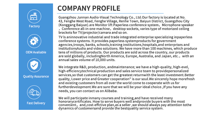 प्रगत इलेक्ट्रिक ओएलईडी स्क्रीन एलसीडी मॉनिटर लिफ्टर मॉनिटर्स सर्व प्रकारच्या दृश्यांसाठी योग्य आहेत, आमच्याकडे सीएनसी मशीन कटिंग तंत्रज्ञान आणि लेझर तंत्रज्ञान आहे, उत्पादन अल्ट्रा-उच्च दर्जाचे असल्याची खात्री करण्यासाठी नवीनतम कॉन्फरन्स टेबल एलसीडी स्क्रीन लिफ्टर तंत्रज्ञान आहे. आमचे सर्व OLED स्क्रीन एलसीडी लिफ्टर मेड इन चायना चे आहेत, घाऊक खरेदीसाठी उपलब्ध आहेत, ग्राहकांसाठी खाजगीरित्या सानुकूलित केले जाऊ शकतात आणि स्टॉकमध्ये पुरेसे इलेक्ट्रिक टच स्क्रीन एलसीडी मॉनिटर लिफ्टर आहेत जे ग्राहकांना जलद वितरणास समर्थन देतात. आणि आमच्या जुन्नन उपकरणांमध्ये CCC, CE प्रमाणपत्र, ROHS, ISO प्रमाणन यांसारखे विविध प्रकारचे प्रमाणपत्र प्रमाणपत्र आहे, उत्पादन सुरक्षित आणि उच्च दर्जाचे आहे, निर्यात पात्रतेसह, अनुकूल किंमतीसह थेट कारखाना आहे, स्वतःचा कारखाना आहे आणि बर्याच वर्षांपासून कार्यरत आहे.